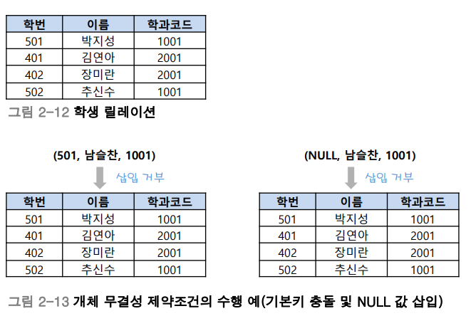 - 릴레이션은 기본키를 지정하고 그에 따른 무결성 원칙 즉, 기본키는 NULL 값을 가져서는 안되며 릴레이션 내에 오직 하나의 값만 존재해야 한다는 조건