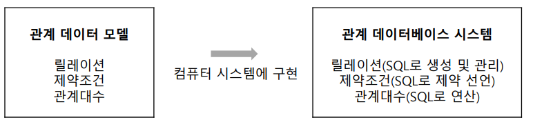- 데이터를 2차원 테이블 형태인 릴레이션으로 표현