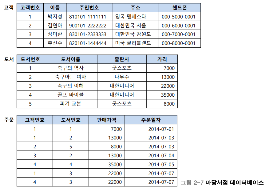 - 도서번호: 도서번호가 2인 '축구아는 여자'는 두 번의 주문 기록이 있으므로 튜플을 유일하게 식별할 수 없음