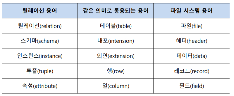 - 간단히 릴레이션이라 부르거나 릴레이션 외연(Relation Extension)이라고도 부름