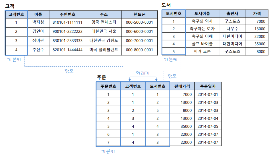 - 다른 릴레이션의 기본키를 참조하여 관계 데이터 모델의 특징인 릴레이션 간의 관계(Relationship)를 표현