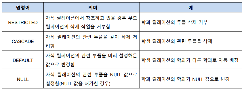- 자식 릴레이션의 값이 변경될 때 부모 릴레이션의 제약을 받음