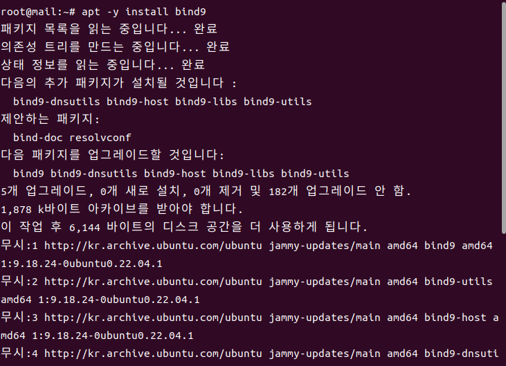 apt -y install bind9 명령어를 사용하면 간단하게 DNS 관련 패키지를 다운로드할 수 있다.