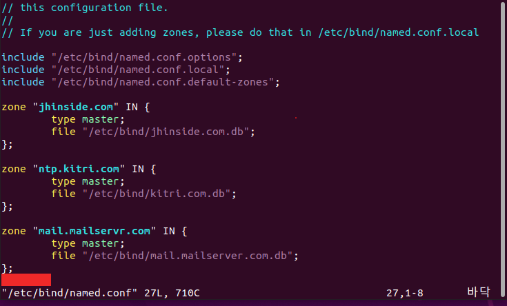 /etc/bind/ 디렉터리로 넘어가서 named.conf 의 설정 파일에 다음과 같이 설정해준다.