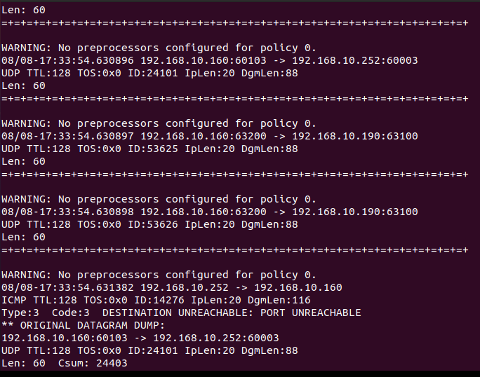 패킷을 보면 UDP 패킷이 뜨는데 위 snort 서버에서도 UDP 패킷 및 TCP 등등이 뜨는걸 볼 수 있다.