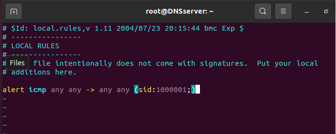alert icmp any any -> any any (sid:1000001;) 입력한 후 저장하고 닫는다.
