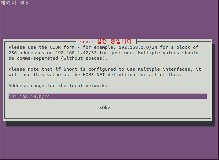 이후 설정값이 두 개 정도 더 나오는데, 둘다 ok만 눌러주면된다. 이렇게 하면 snort는 설치가 완료되었다.