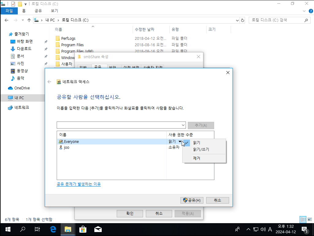 만든 폴더를 마우스 오른쪽 버튼으로 클릭 후 [속성] 선택. [공유] 탭에서 <공유>를 클릭하고 'everyone' 사용자를 추가한다.