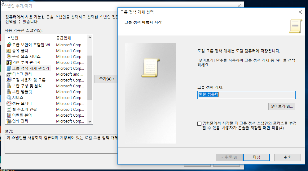이후 [그룹 정책 개체 편집기] 를 추가 및 마침