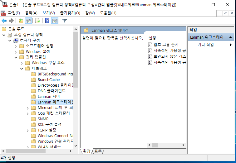 이후 콘솔1로 돌아와 [로컬 컴퓨터 정책]을 선택해 [관리 템플릿] - [Lanman 워크스테이션]을 선택하고 오른쪽 설정의