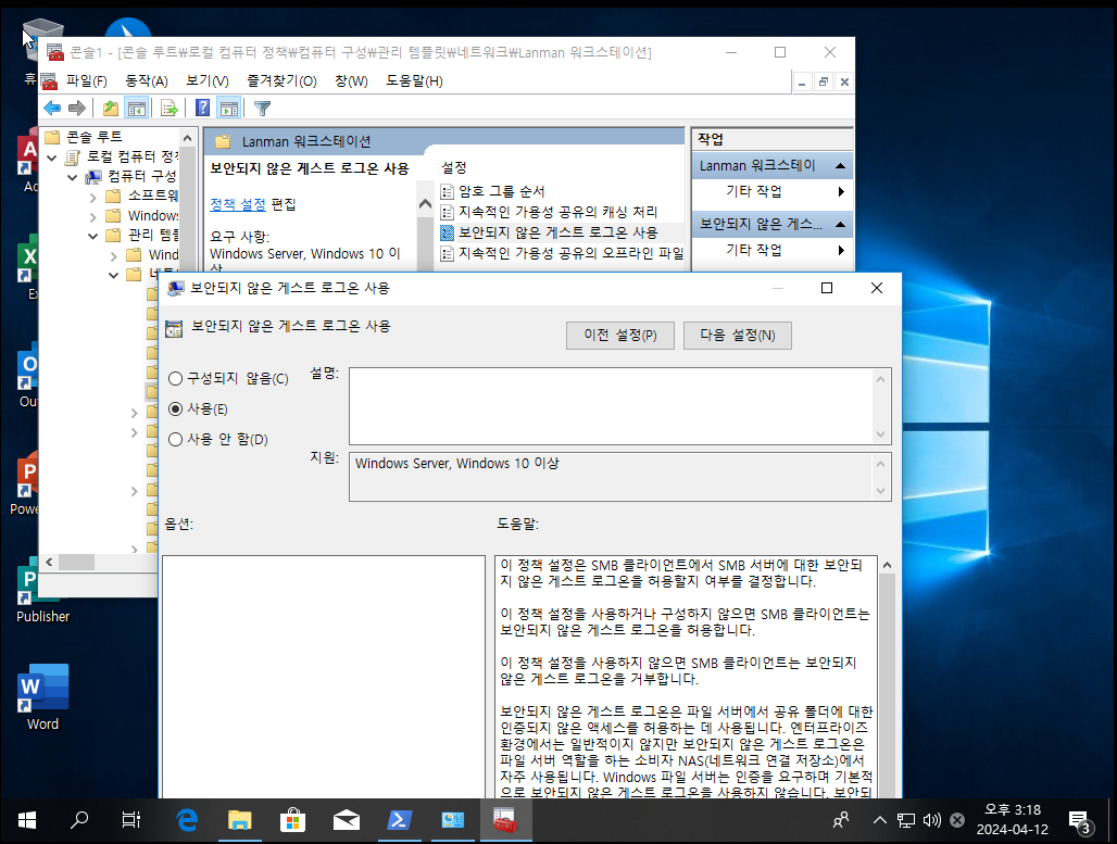 [설정되지 않은 게스트 로그온 사용]을 더블클릭, [보안되지 않은 게스트 로그온 사용] 창에서 '사용' 선택 후 확인