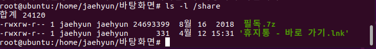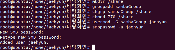 기존에 우분투 사용자인 jaehyun을 sambaGroup에 포함시켰다. (본인은 비밀번호를 0520으로 설정)