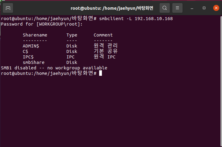 'smbclient -L WinClient_IP address' 명령어를 입력하고 설정한 비밀번호를 입력한 후 공유한 폴더 및 프린터가 보이는지 확인한다.