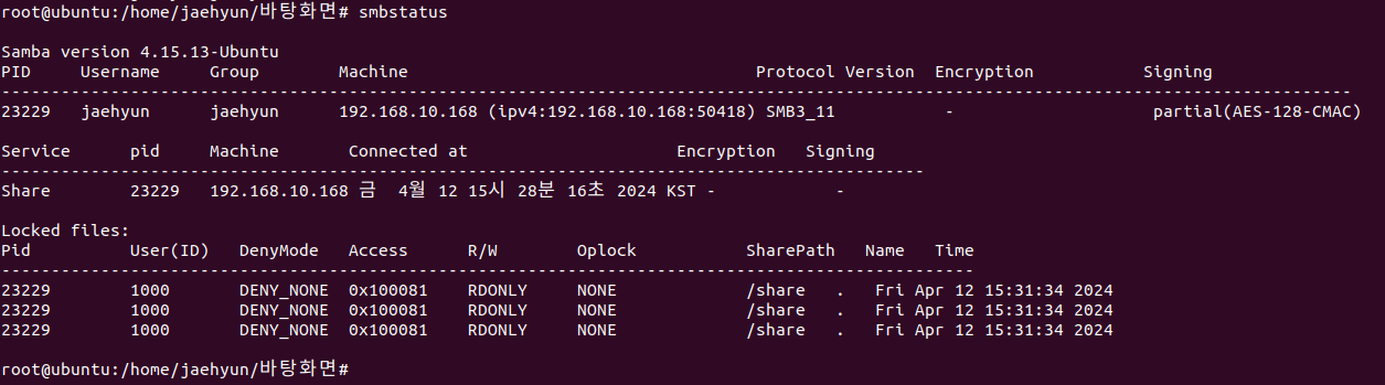 'smbstatus' 명령으로 현재 Samba 서버에 접속한 Windows를 확인 할 수있다. (본인은 192.168.10.168 컴퓨터에서 접속)