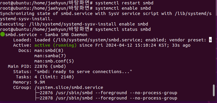 systemctl restart/enable/status smbd 명령으로 samba 서버를 시작/상시가동/상태 확인하도록 설정